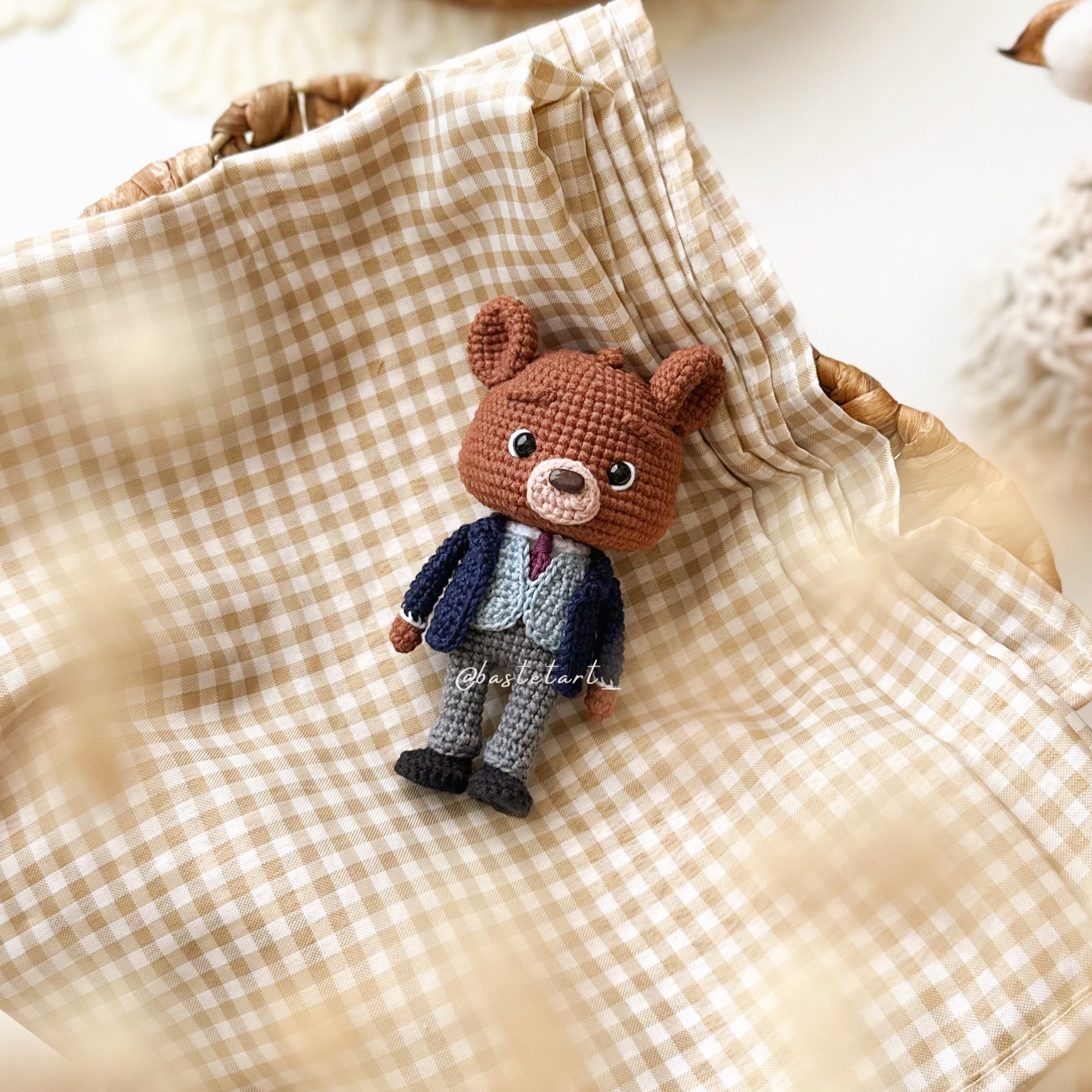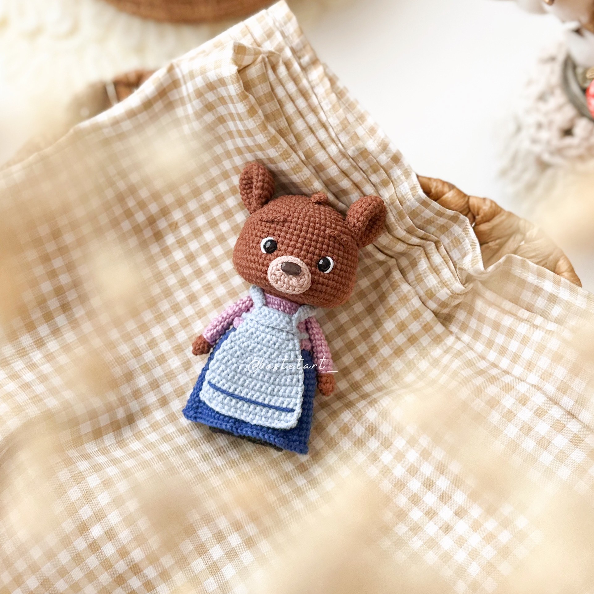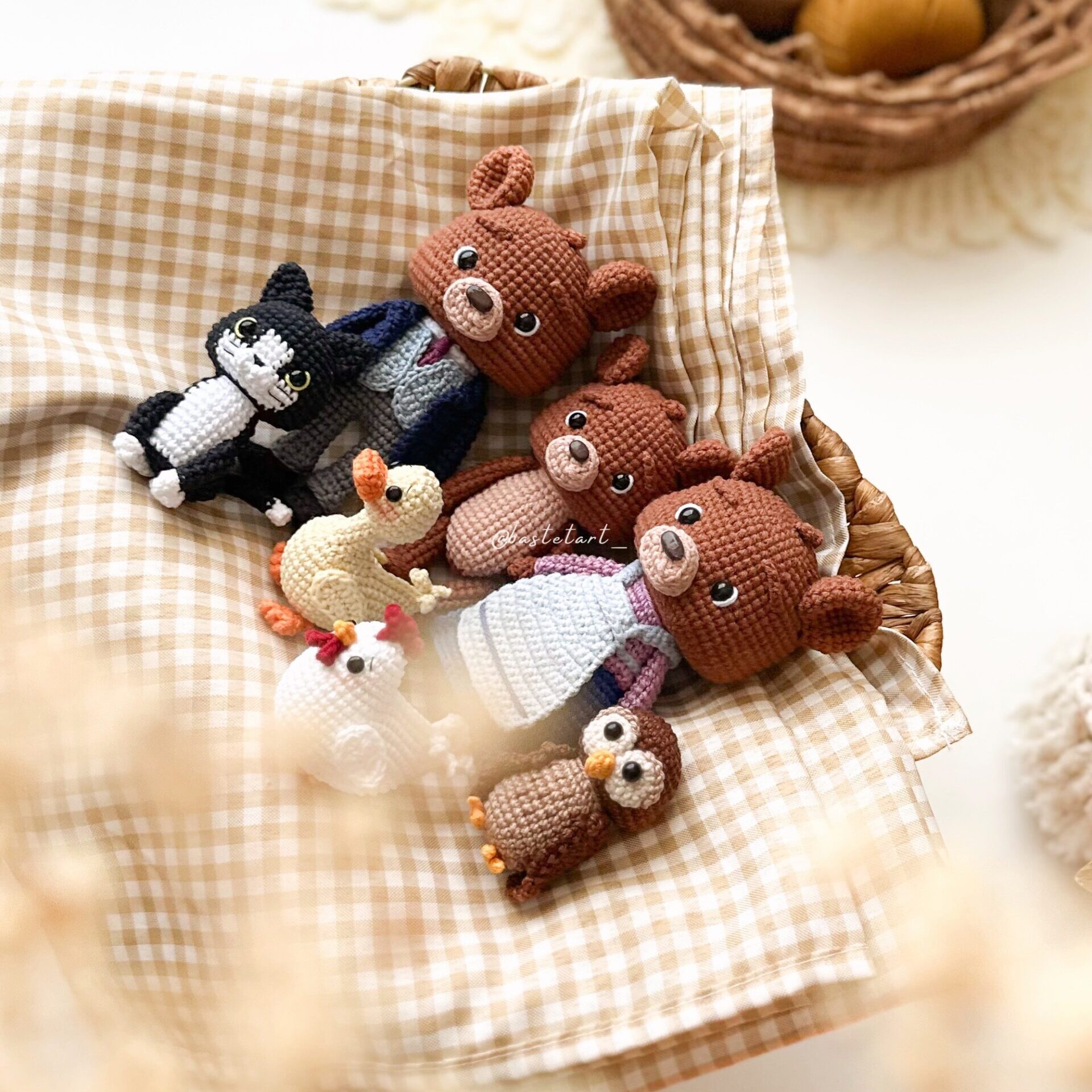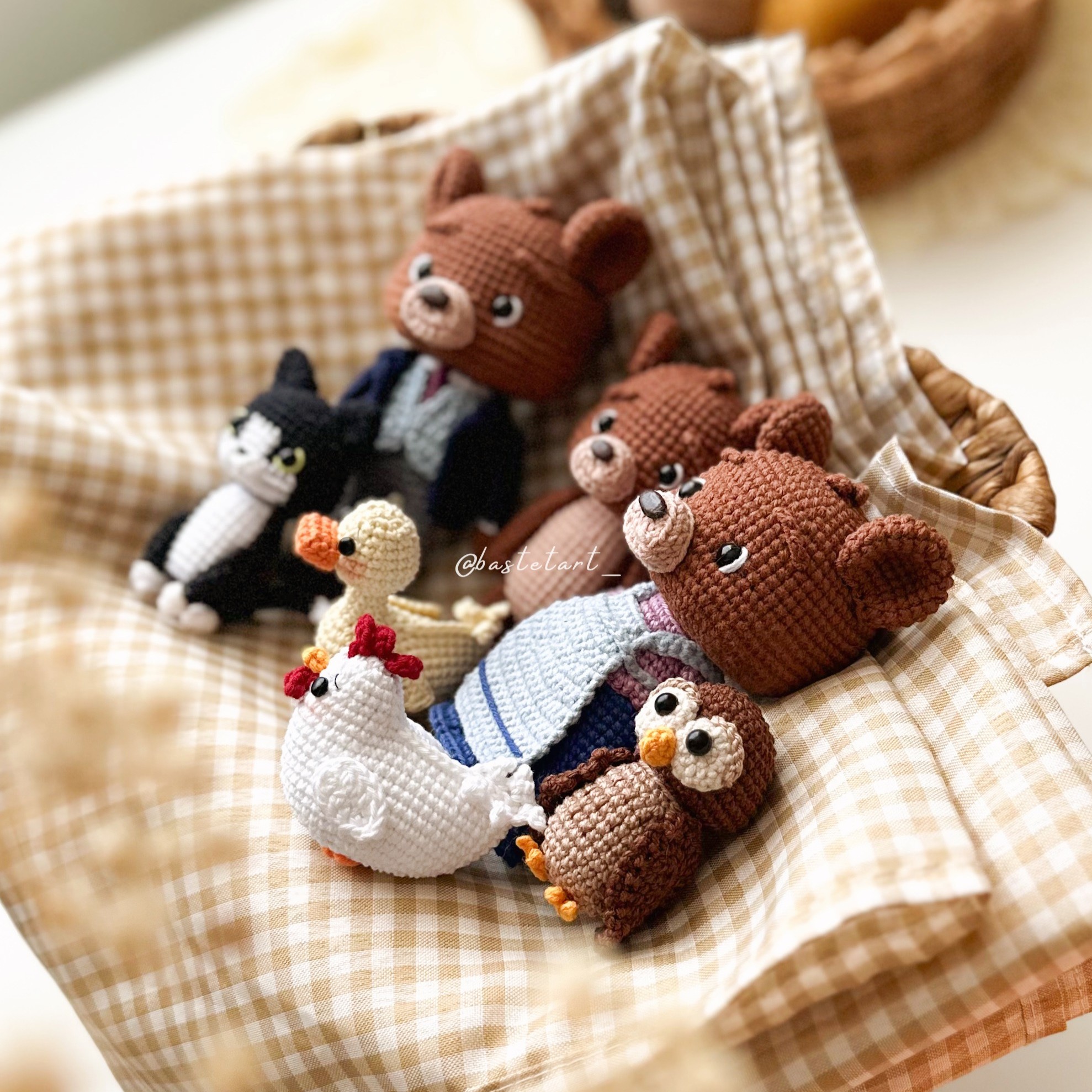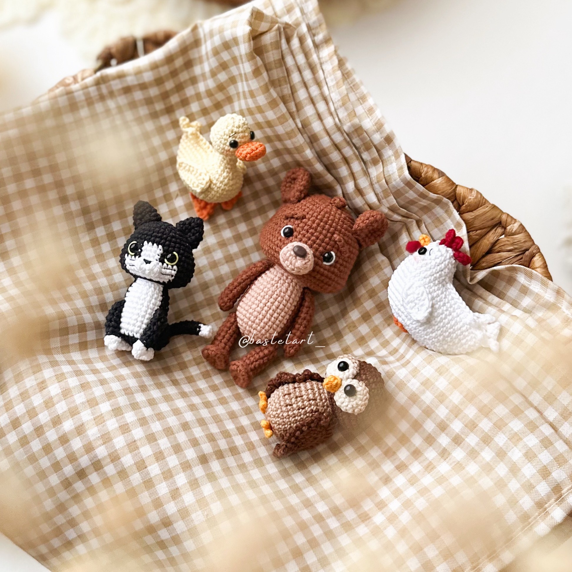 - Approximate size: Little Bear 11cm (4,3″), Owl and Duck 6cm (2,3″), Chicken 5cm (1,9″), Cat 8cm (3,1″), Mama Bear 12,5cm (4,9″) and Papa Bear 13,5cm (5,3″) (using a 2mm crochet hook, X stitch and hight tension);